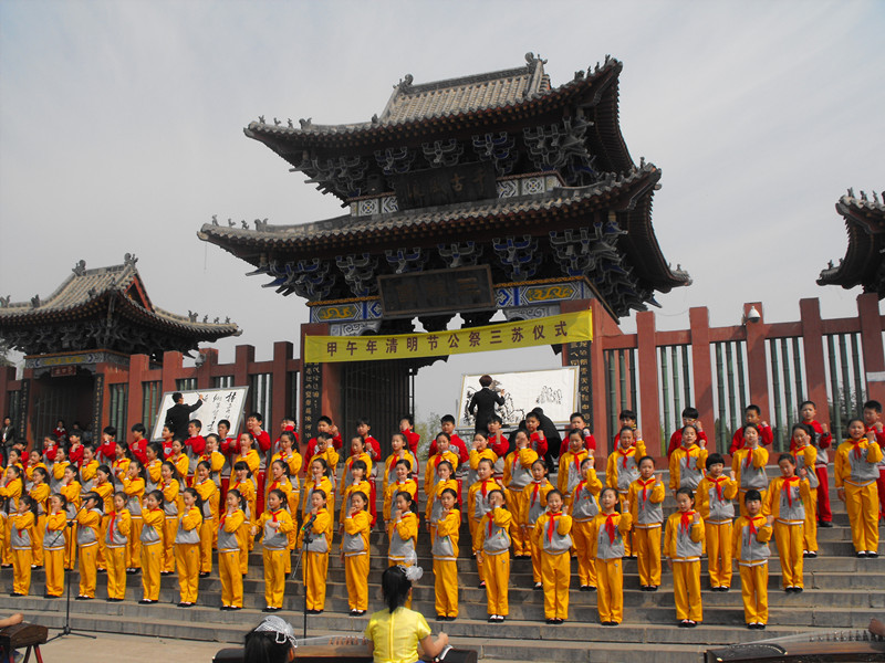 4月2日上午10时,为缅怀三苏先生(宋代大文学家苏洵、苏轼、苏辙),光大三苏人文情怀,传承三苏精神,持续推动三苏文化进校园活动,由郏县政协、郏县文化旅游产业领导组主办,郏县文化旅游局、郏县教体局、茨芭镇政府承办的“2014年(甲午年)清明公祭三苏活动”在郏县三苏园文化广场隆重举行。